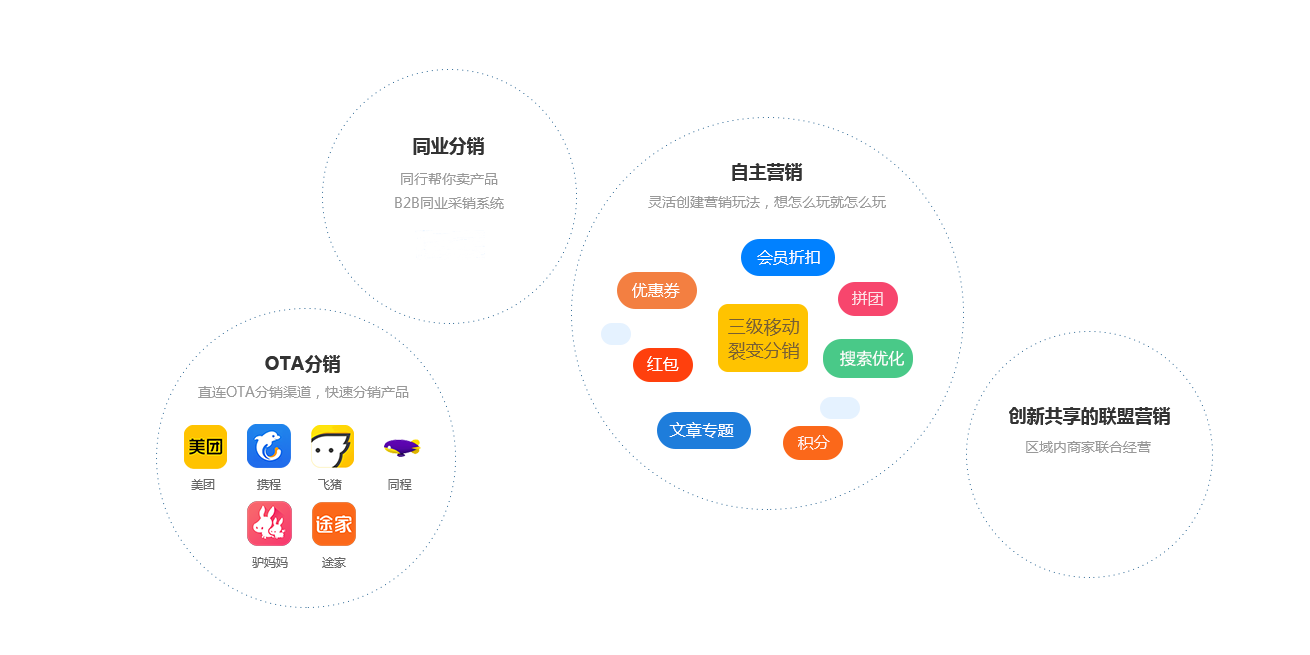 提供OTA分銷(xiāo)、同行渠道分銷(xiāo)、自主營(yíng)銷(xiāo)玩法(移動(dòng)裂變分銷(xiāo)、優(yōu)惠劵、秒殺等)、創(chuàng)新共享聯(lián)盟營(yíng)銷(xiāo)等多種營(yíng)銷(xiāo)策略,